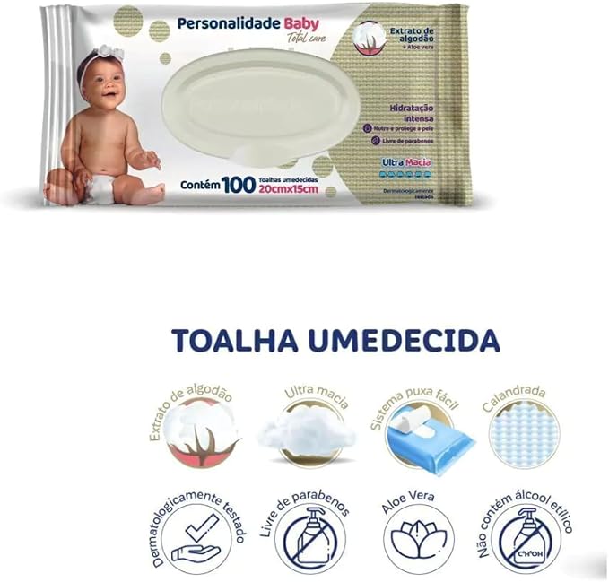 A Toalha Umedecida Personalidade Baby Plus com 100 unidades é ideal para o cuidado diário com a pele delicada do bebê. Sua fórmula contém extrato de algodão, aloe vera e garante hidratação intensa, proporcionando suavidade e frescor a cada uso. É livre de parabenos, não contém álcool etílico e é dermatologicamente testada, oferecendo segurança e proteção. Com toalha calandrada, ultra macia e sistema puxa fácil, combina praticidade, carinho e qualidade em um só produto.
